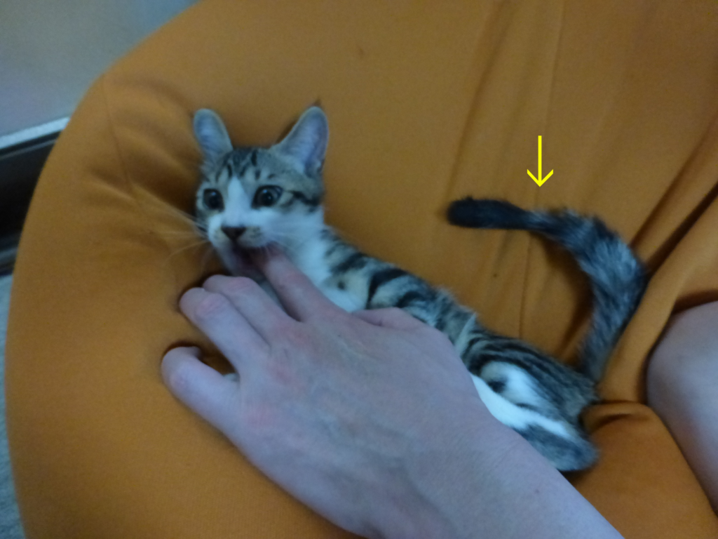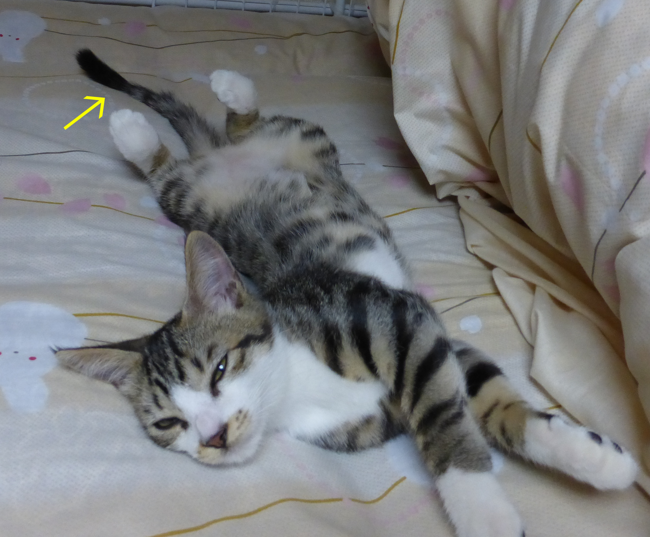 上の写真の矢印部分はテープを巻かれていて細くなってしまったシッポです。後日撮影